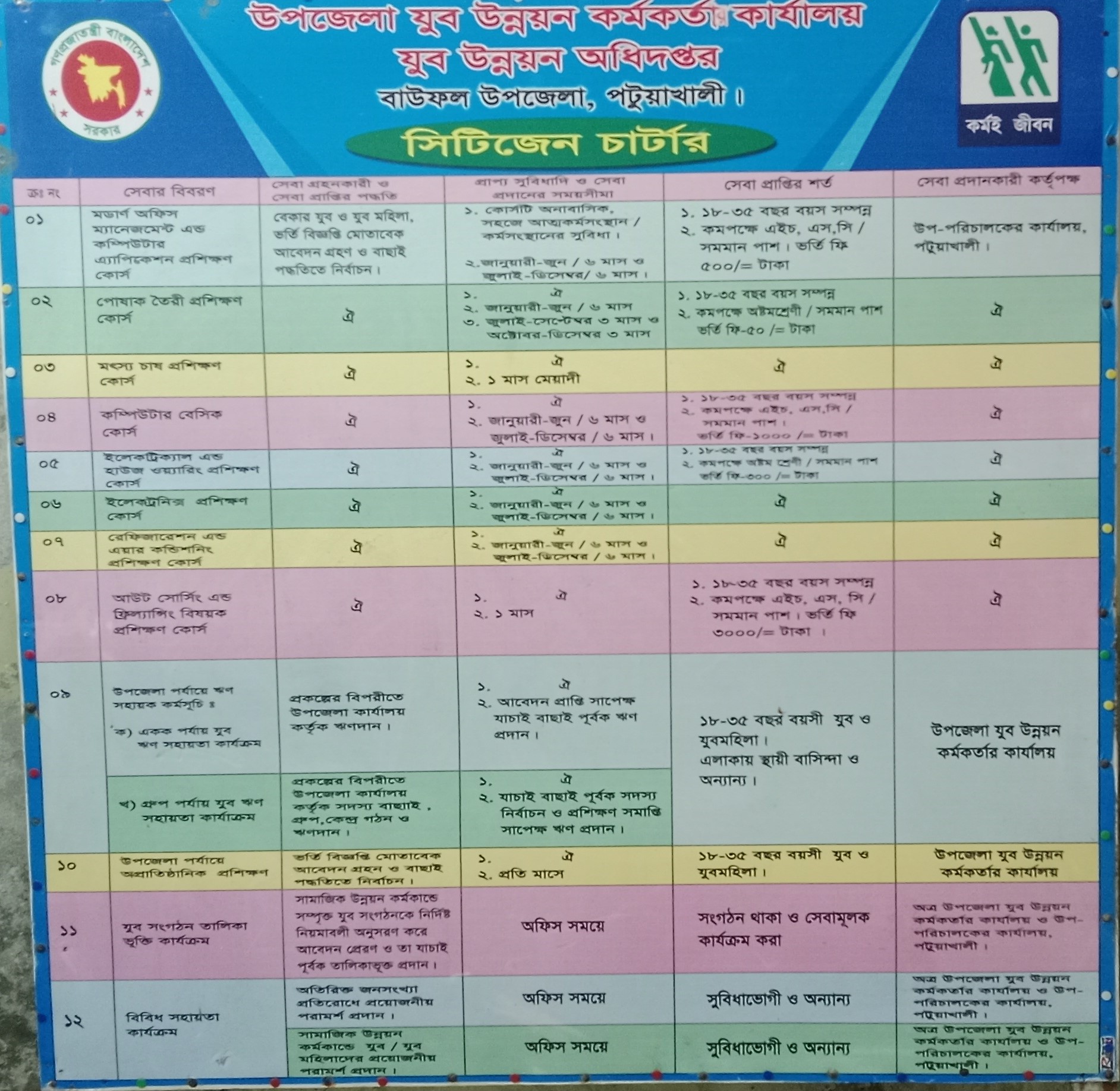 ১ | উদ্বুদ্ধকরনপরামর্শপ্রদান | ১৮-৩৫বছরবয়স্কযেকোনযুব/ যুবমহিলা | উপজেলাউন্নয়নকর্মকর্তাওকর্মচারীবৃন্দ | বিনামূল্যে | অফিসচলাকালীনসময়ে |